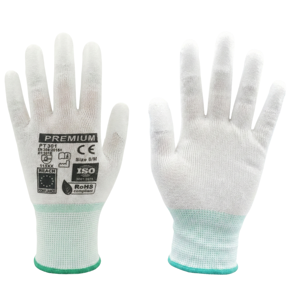 | PU White Palm | Polyester + PU ขาว (เต็ม) | สะอาด / กระชับเต็มฝ่ามือ | ตรวจสอบ QC / แพ็กกิ้ง |